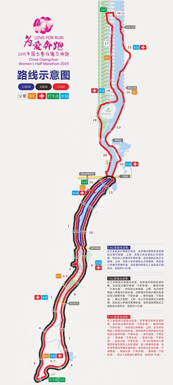 21公里赛段设置饮水站6处,医疗点6处,卫生间依托伊通河生态长廊公共卫生系统,主场地1处,其余4处,分别位于:2.5公里处,5.7公里处,14公里处和17.3公里处;
