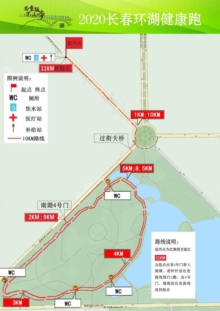 (3)跑步路线全长约11公里,起终点为:百脑汇;具体路线:百脑汇出发--沿着工农大路--新民广场--跨欧亚新生活天桥--延安大街--南湖4号门--逆时针南湖内2圈--从4号门出--沿延安大街--欧亚新生活跨延安大街天桥--工农大路--返回百脑汇终点;