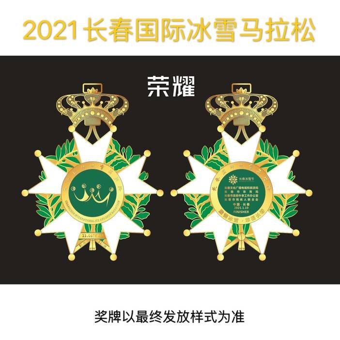 (5)2021长春国际冰雪马拉松奖牌名称命名为:“荣耀”;以下为效果图版本(以当天最终实际发放奖牌为准)