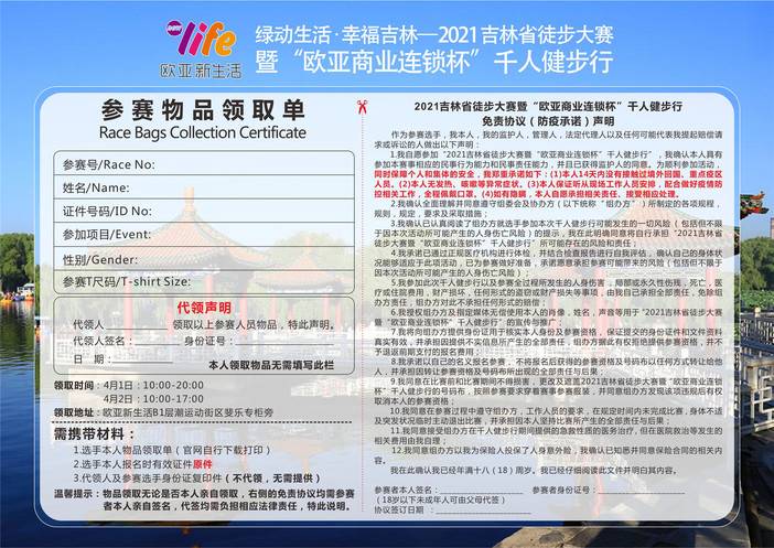 需要特别注意:领取单的右侧为免责协议,请自行签署好自己的名字及身份证号码与签署日期(日期为活动当天的日期),未满18岁儿童需要将名字和监护人(父母)签署在一起即可;