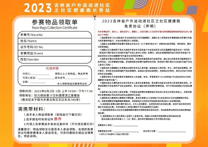 输入姓名及身份证号查询个人参赛号,并可下载物料领取单!