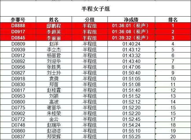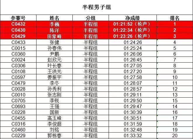 成绩说明:以上公布信息,半程男子组、女子组前三名取枪声成绩,4-20名取净成绩。