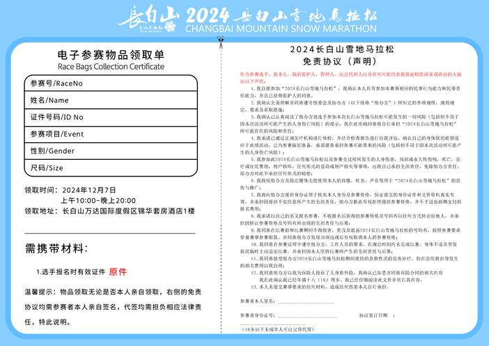 需要特别注意:领取单的右侧为免责协议,请自行签署好自己的名字及身份证号码与签署日期(日期为活动当天的日期),未满18岁儿童需要将名字和监护人(父母)签署在一起即可;