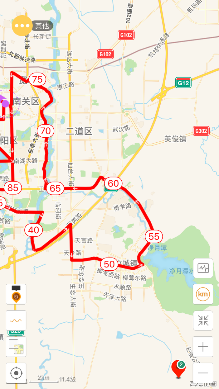 【全程起点】南湖公园解放纪念碑起点(0.0KM)(新民广场)——绕新民广场进入新民大街---沿新民大街向北--进入解放大路---沿解放大路向东---解放大路与同志街交汇(3.0KM)---沿同志街向北----同志街与西安大路交汇----沿西安大路向西---抵达西安广场(8.0KM)---绕西安广场----沿正阳街向南---正阳街--景阳广场(10.0KM)--正阳广场--绕正阳广场进入湖西路---湖西路与普阳街交汇(11.0KM)---沿普阳街向西南进入东风大街----沿东风大街一直抵达红旗广场(21.0公里)——绕红旗广场进入凯达北街----从凯达北街进入首创北路----首创北路与西湖大路交汇(22.0KM)---沿西湖大路向南经大洲广场(25.0KM),继续沿西湖大路向南----进入超达大路---超达大路与光谷大街交汇---沿着光谷大街东北---光谷大街与蔚山路交汇(29.0KM)——沿蔚山路向东--蔚山路与人民大街交汇(吉林省图书馆)过人民大街进入南环城路---南环城路与彩霞街交汇(38.0KM)(进入南溪湿地公园)——沿彩霞街进入河堤东路——沿河堤东路一直向南---河堤东路与和美路交汇(41KM)---沿和美路向东与生态大街交汇----沿生态大街向南---生态大街与福祉大路交汇(47.0KM)——沿福祉大路向东---过福业广场——福祉大路与长青公路交汇(52.0KM)【半程终点】轻轨福祉路站
