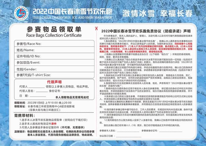 (1)疫情中,高风险区选手禁止参赛,已经报名的选手由于疫情突发我们会保留参赛选手名额参与2023年冰雪马拉松;请添加微信:15604408502进行申请提交,谢谢,申请提交截止到2022年1月5日;