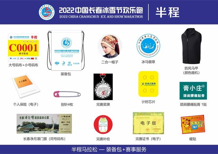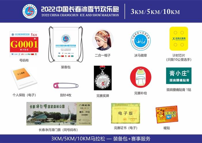 | 项目 | 号码布 | 小号码布 | 芯片 | 马甲 | 2合1帽子 | 膏小庄贴膏 | 暖贴 | 装备包 | 徽章 | 奖牌 | 保险 |