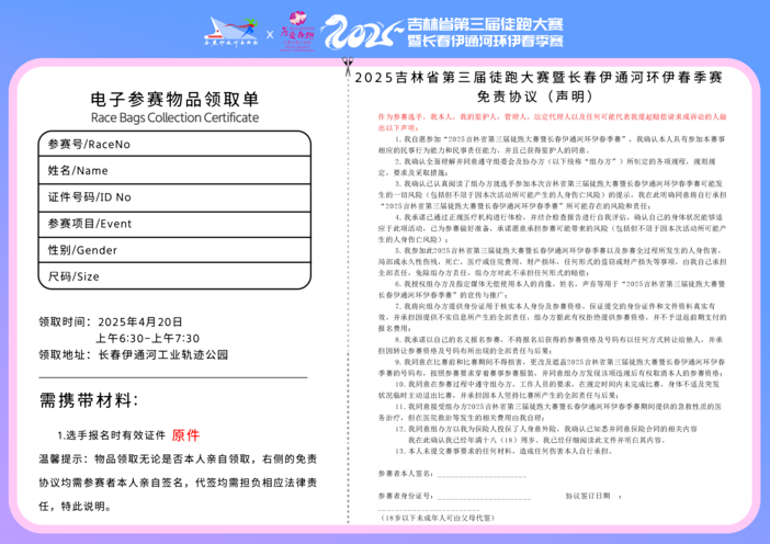 需要特别注意:领取单的右侧为免责协议,请自行签署好自己的名字及身份证号码与签署日期(日期为活动当天的日期),未满18岁儿童需要将名字和监护人(父母)签署在一起即可;